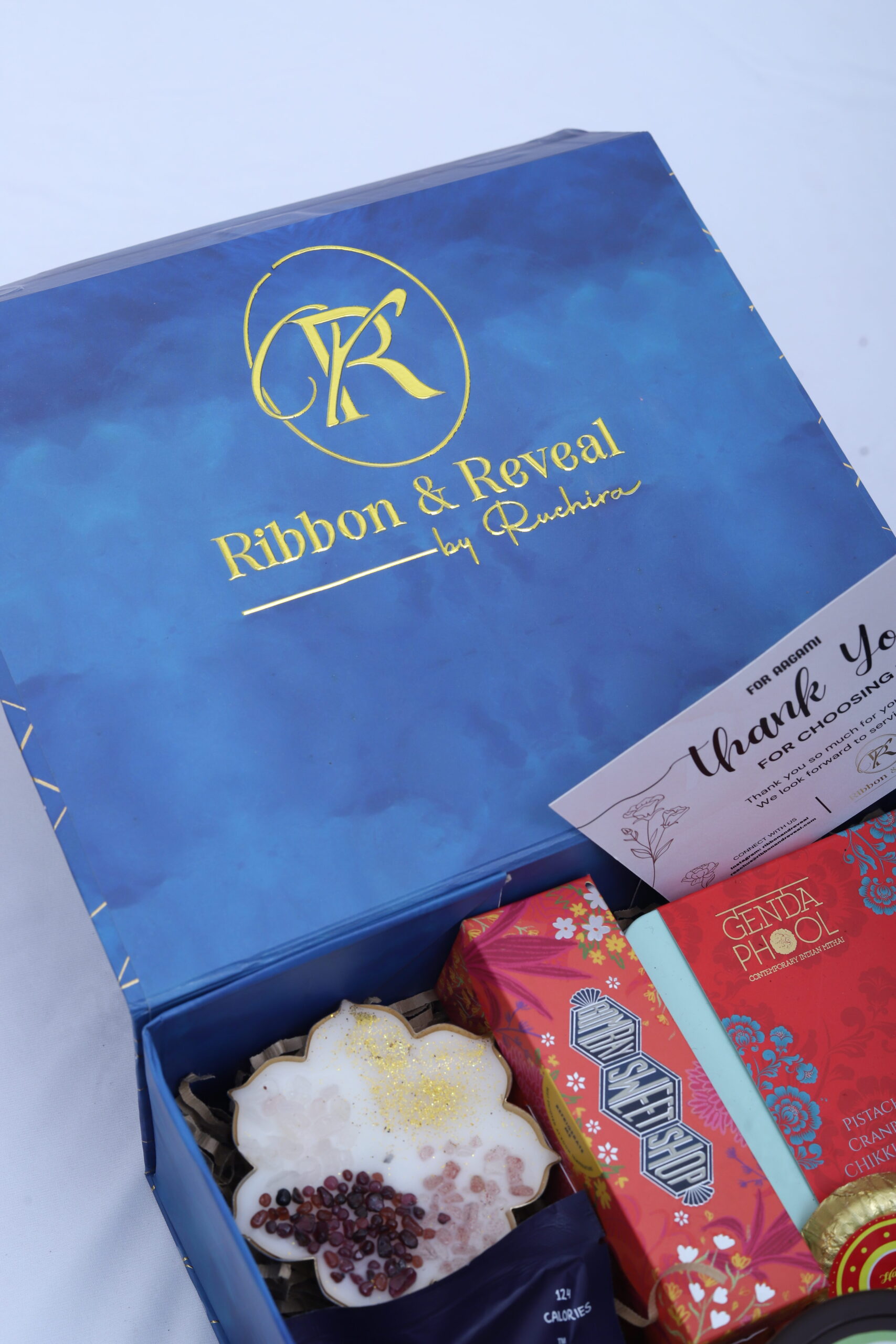 Hamper or Tray specification: Blue box self-design in gold