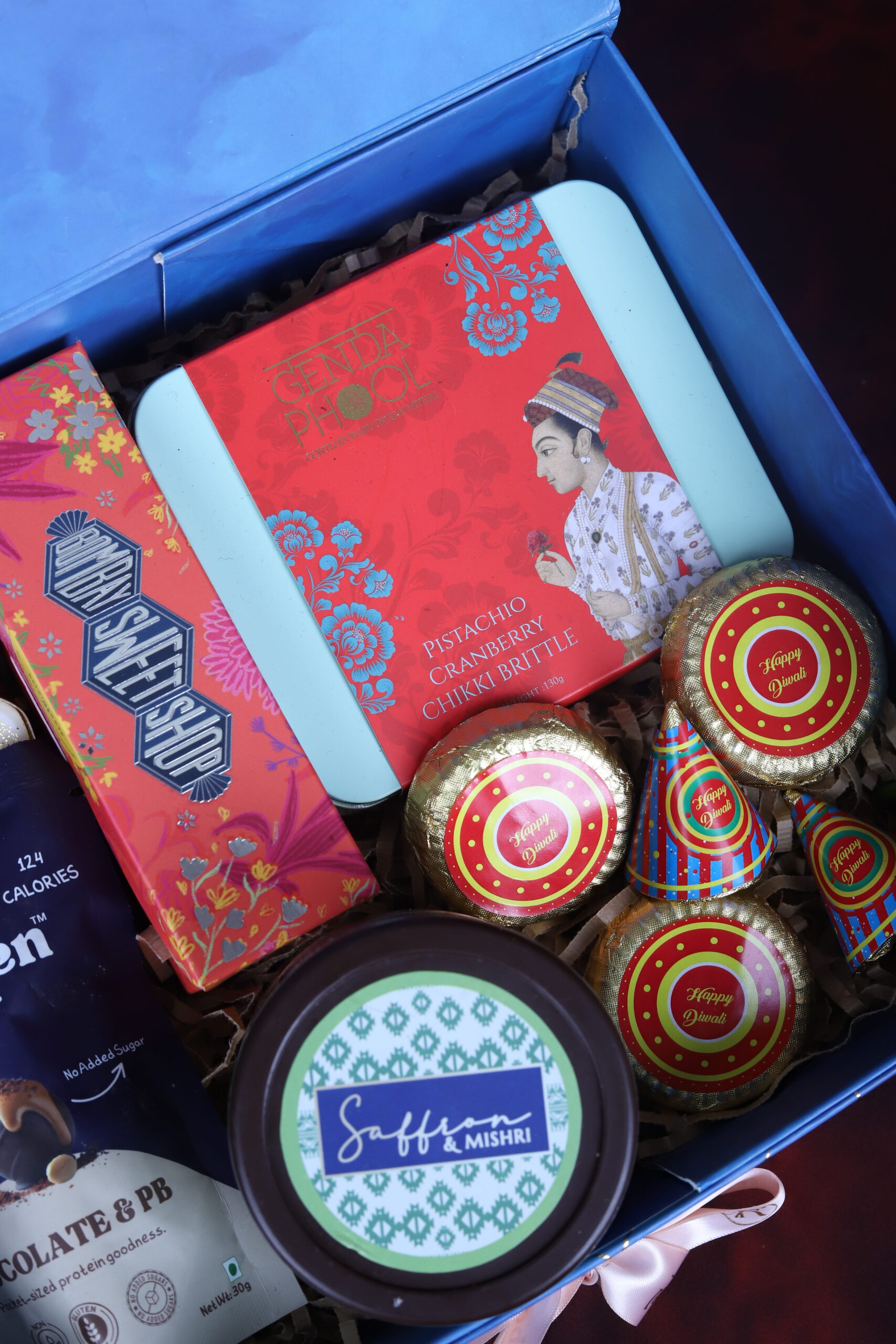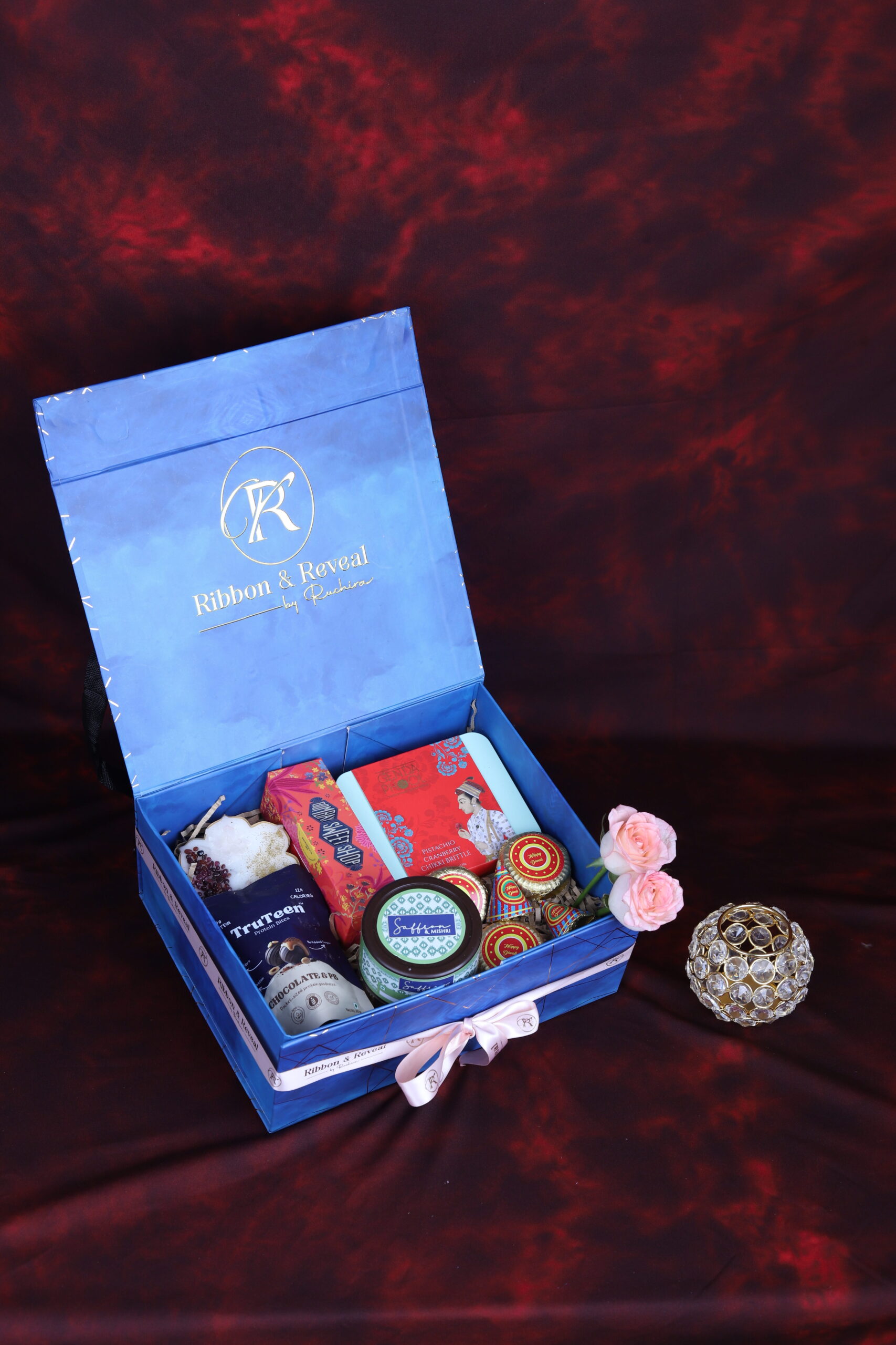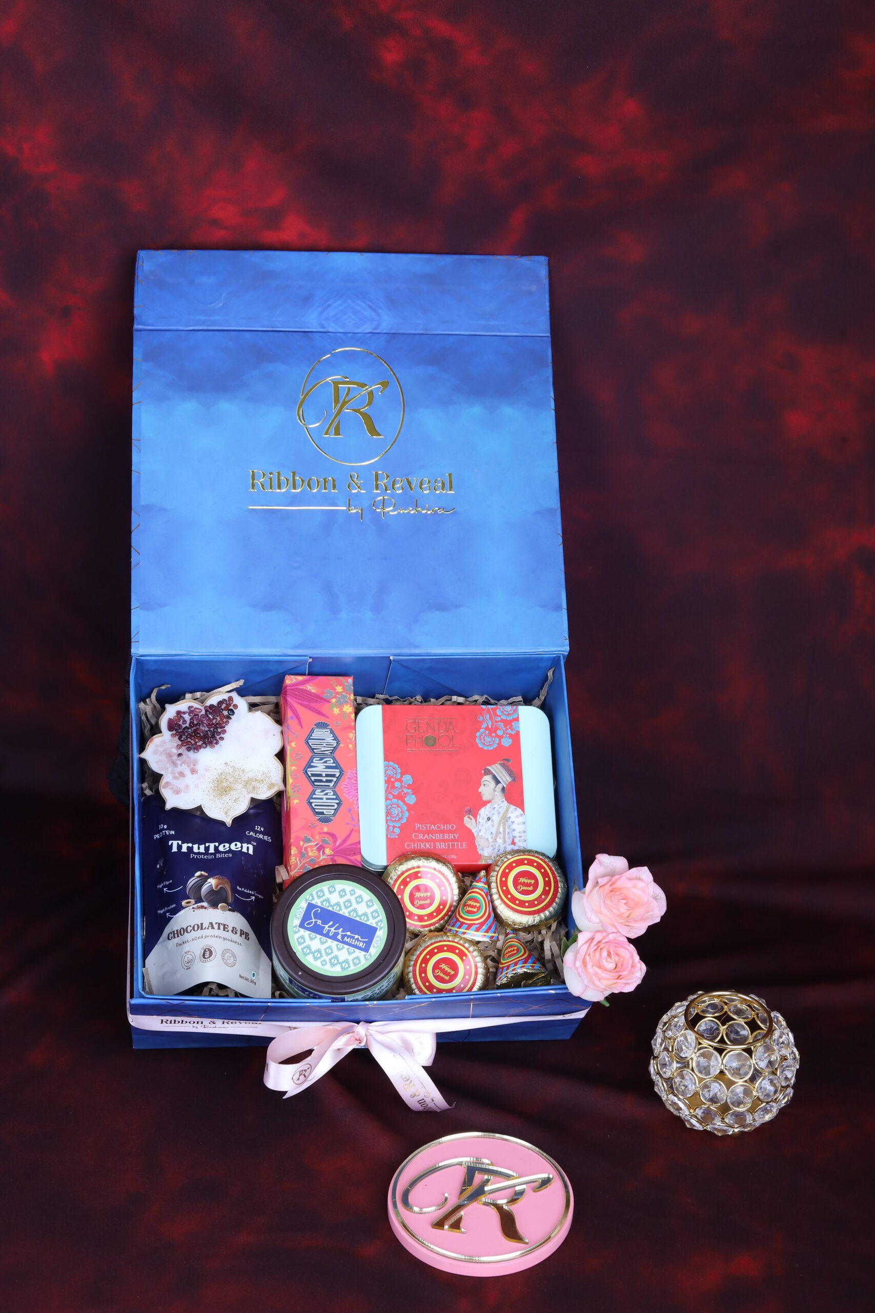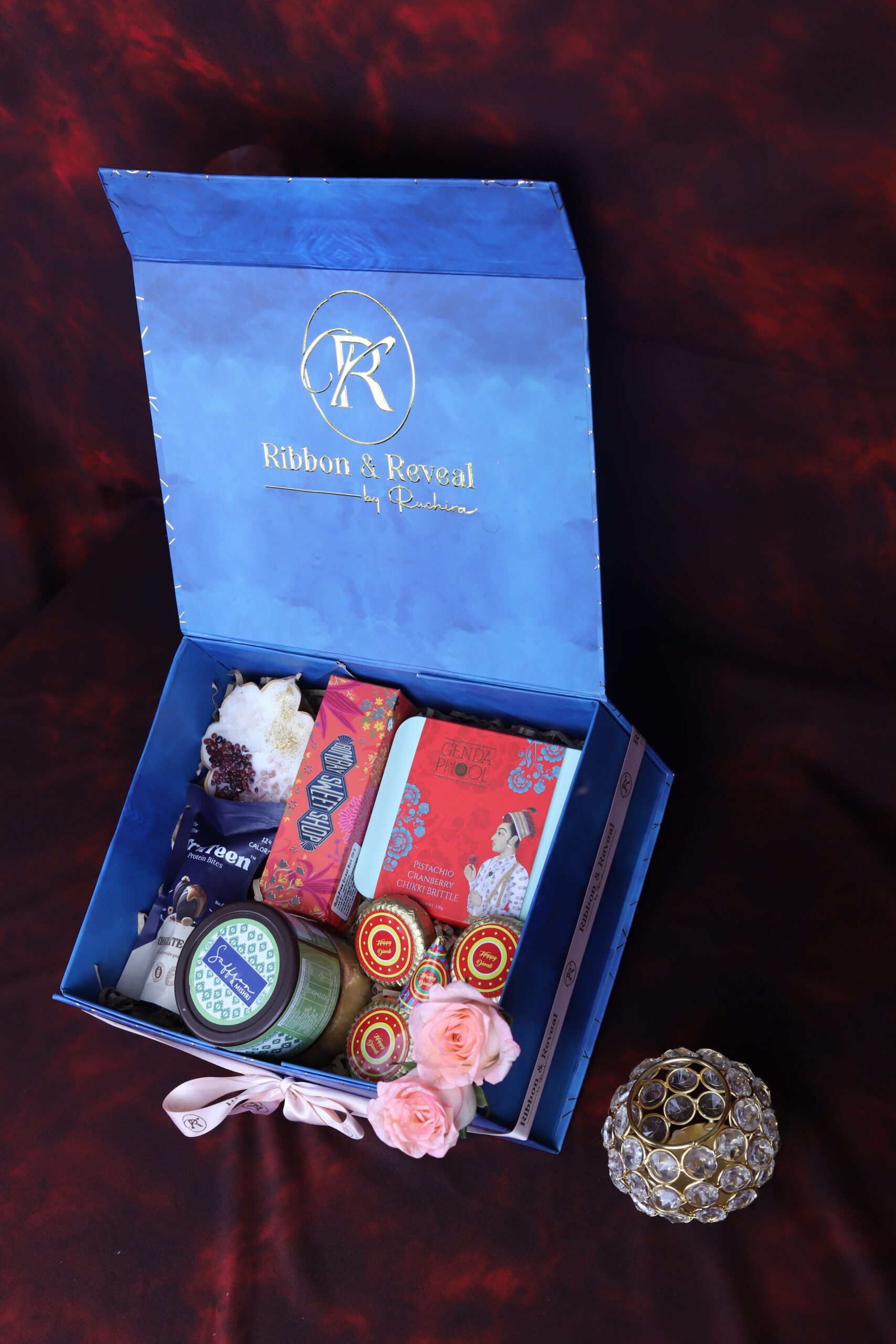 Lotus Urli Candle with Crystal | Mithai Box | Chikki Brittles | Pista Butter Cookies | Chocolate Protein Bites | Diwali Crackers Chocolates | 1 Festive wishes message card