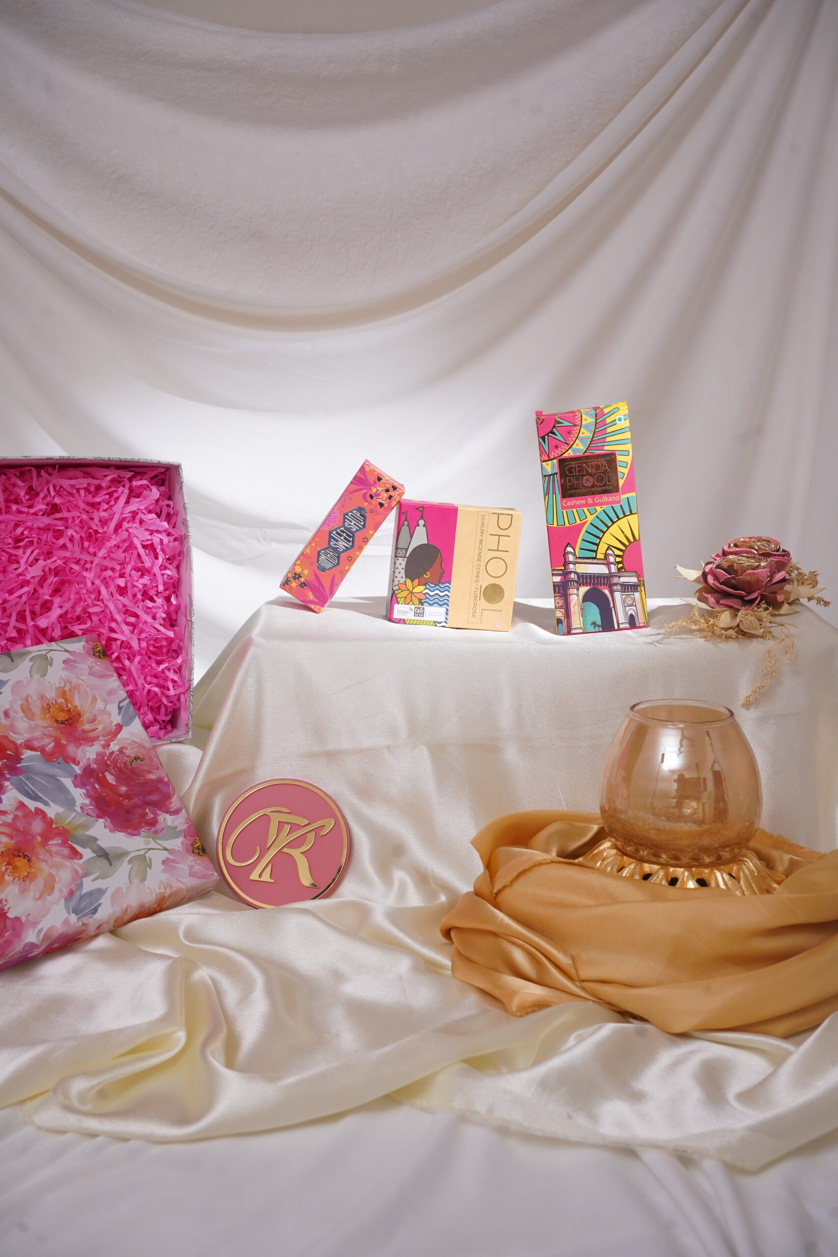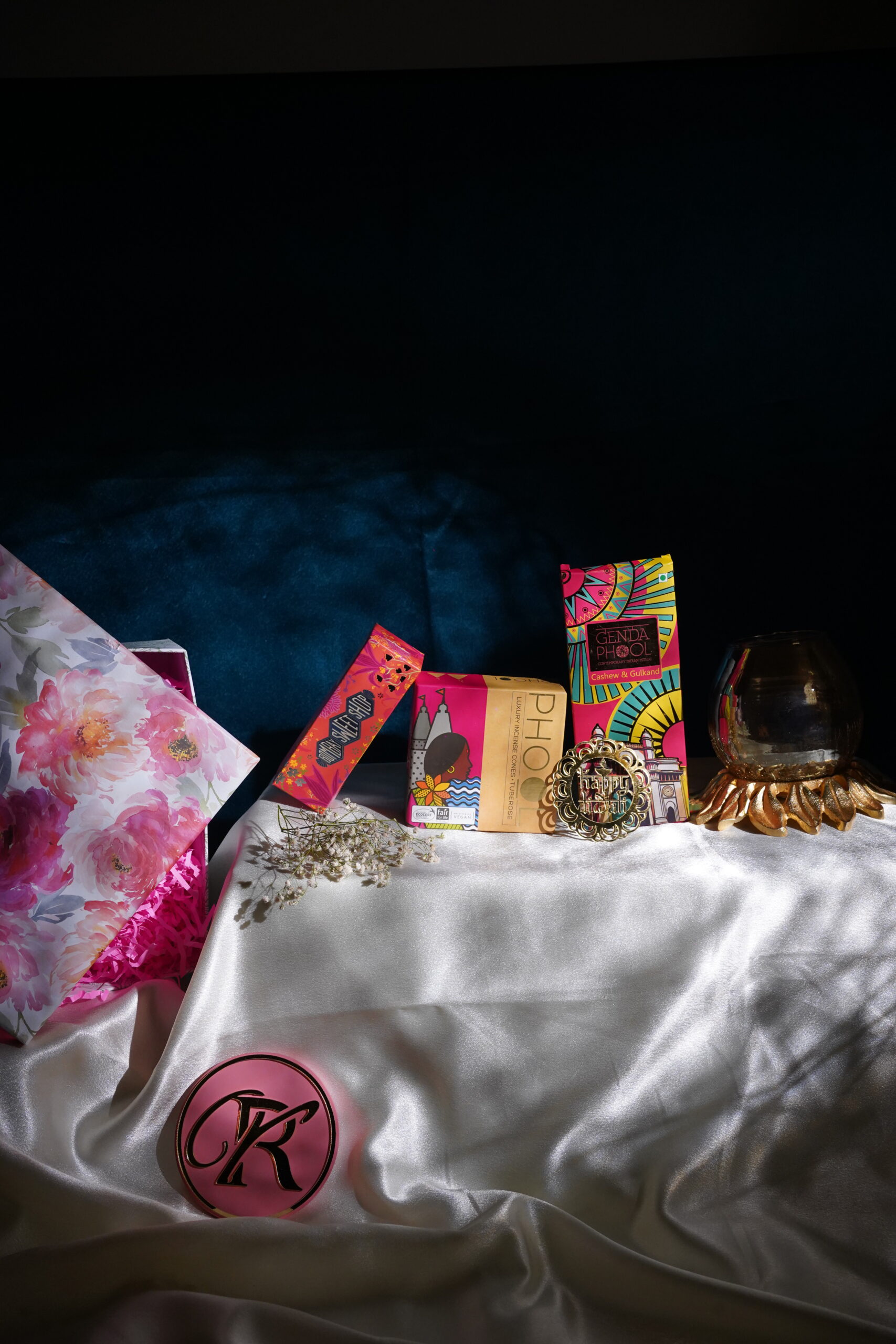 Mithai Box | Cashew & Gulkand bites | Luxury Essence Cones | Glass Lotus Candle Holder | 1 Festive wishes message cardÂ