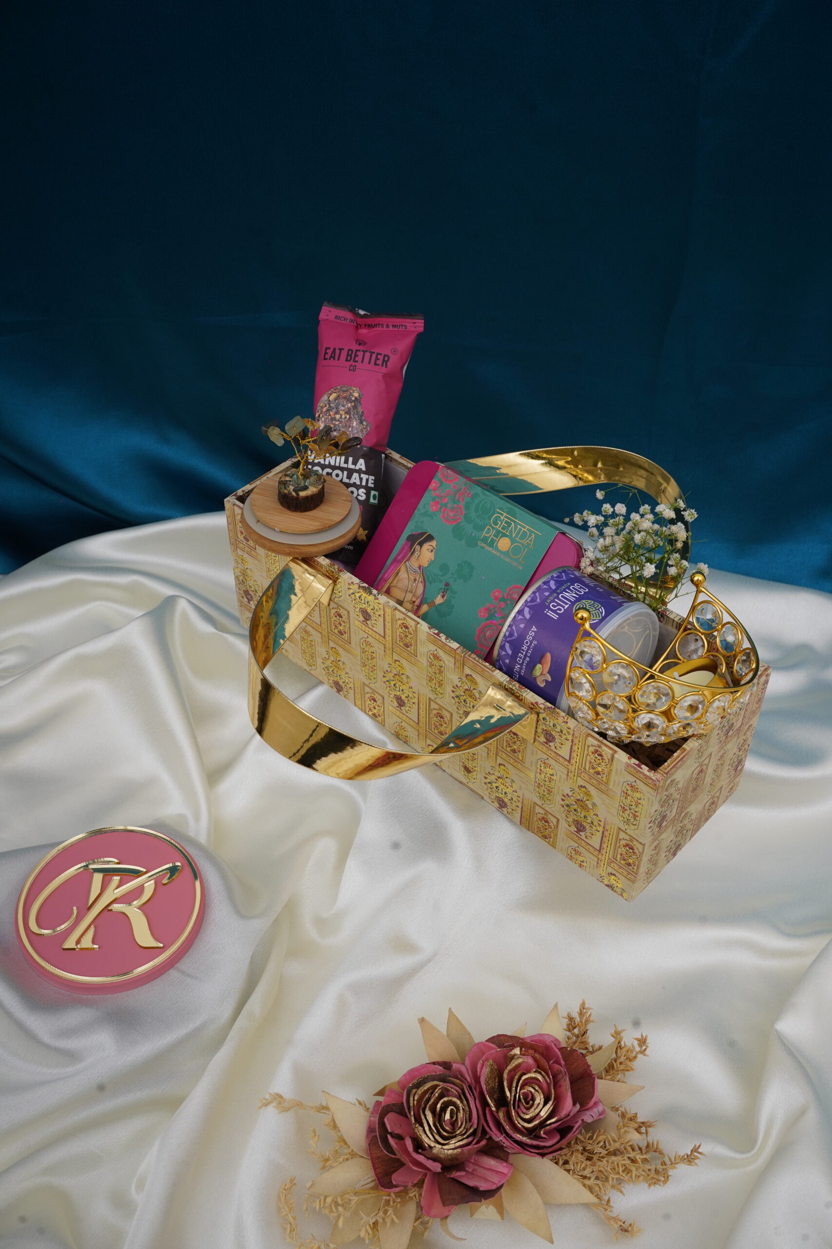 Chikki Brittles | Salted Assorted Nuts | Crystal Candle Holder (Moon Shape) | Crystal Tree Jar | Vanilla Chocolate Laddoos | 1 Festive wishes message card